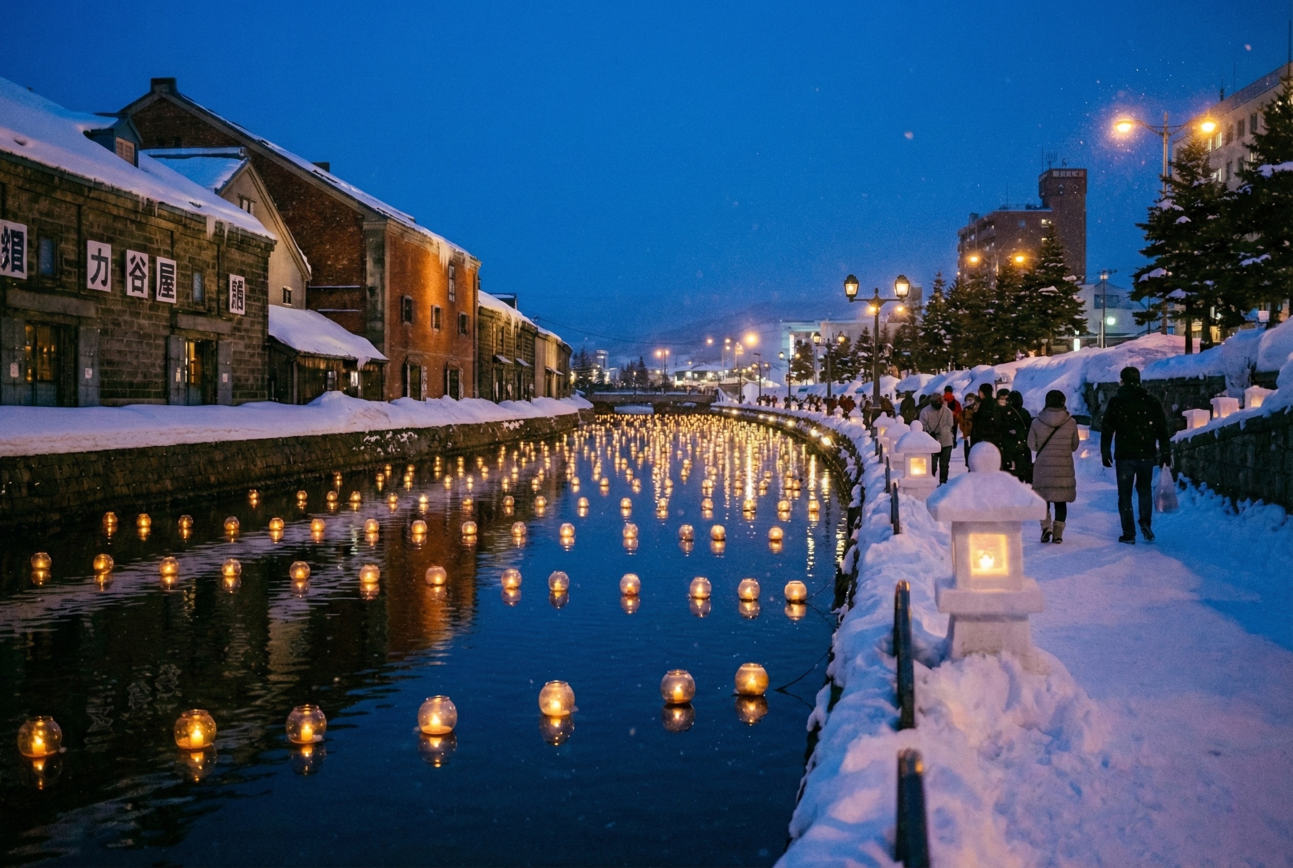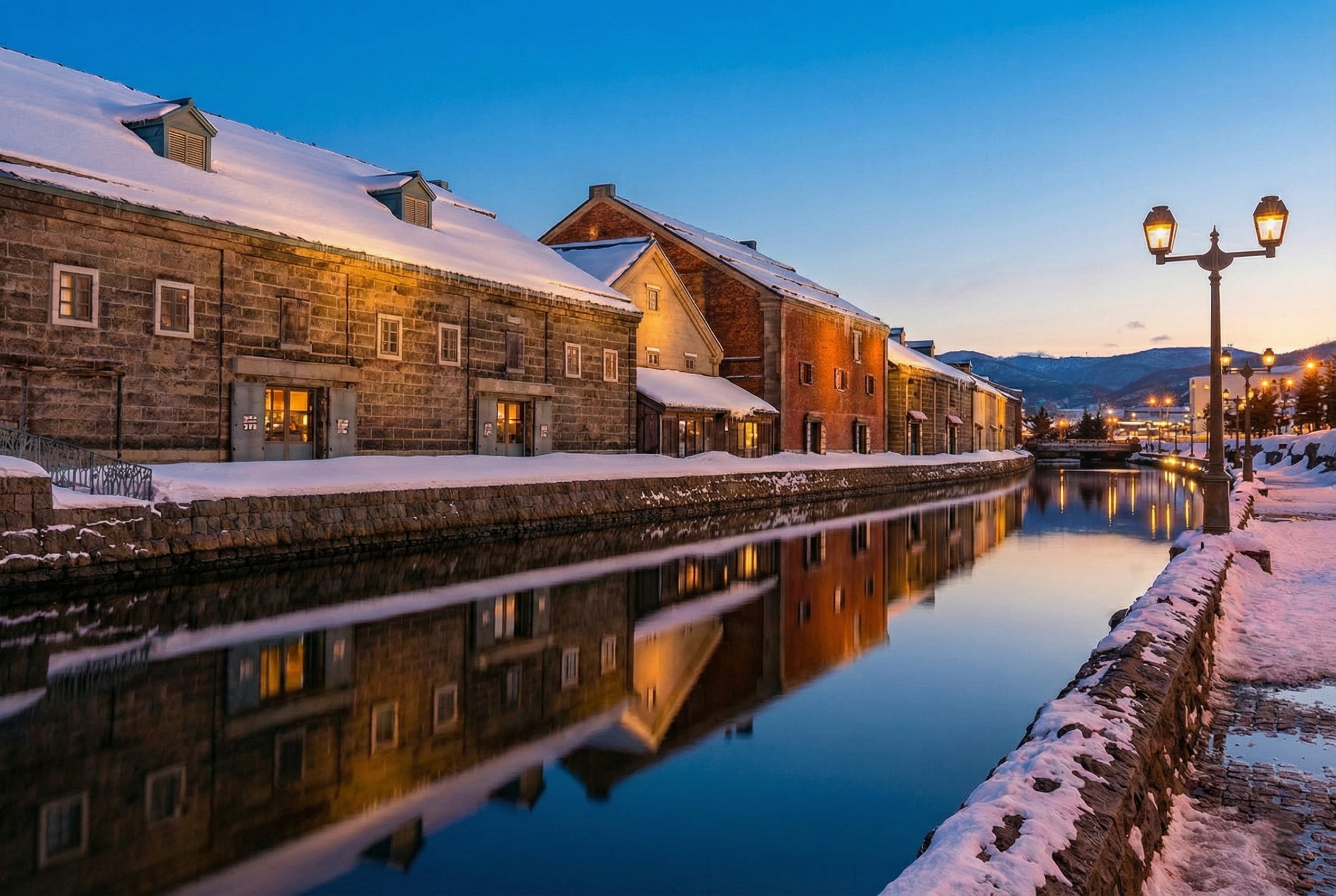 The heart of Otaru is its iconic canal, where century-old stone warehouses and vintage gas lamps create a timeless scene. The canal is especially magical in winter, as snow blankets the area and evening lights reflect on the water, offering photographers and romantics a perfect backdrop.