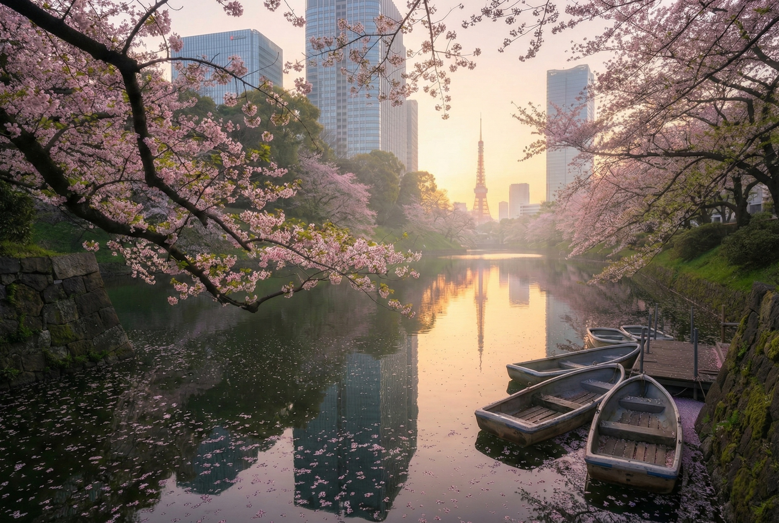 Chidorigafuchi Moat is renowned for its breathtaking Sakura bloom Tokyo tunnel, where cherry trees arch gracefully over the Imperial Palace’s serene waters. Visitors can rent a rowboat to glide beneath cascading petals, creating a truly romantic hanami scene.